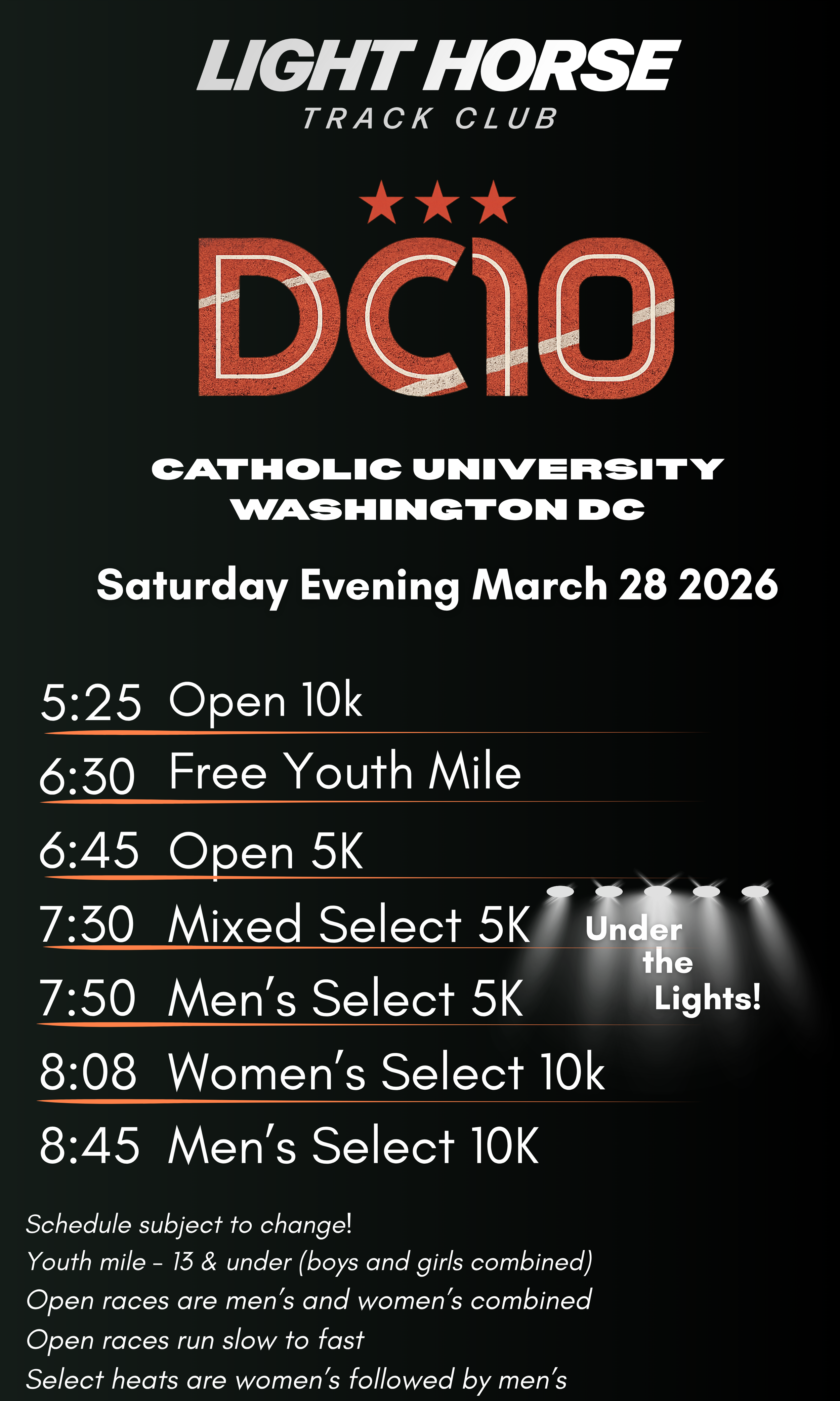 DC10 is our latest community-to-pro track meet built for PR opportunities at the perfect time of year. Hosted at Catholic University in Washington, D.C. - this meet brings together open and select/championship racing in a high-energy atmosphere with DJ, announcers, and food trucks.